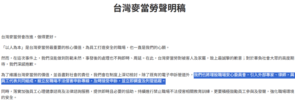 麥當勞在此次事件做了以下事情